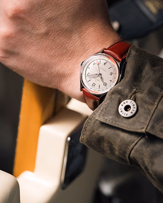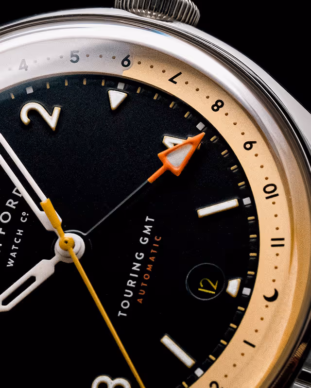 The Touring GMT features this dual time zone functionality that works a little bit differently than most GMT watches on the market. Instead of the usual 24 hour scale with midnight located at the top, the Touring GMT uses an AM/PM scale that is visually split between daylight and nighttime halves, with midnight at the bottom. This allows the wearer to quickly understand if it’s daytime or nighttime back home, giving a more visual connection to loved ones than the more complex military time can.