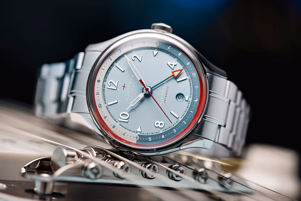 The Touring GMT features this dual time zone functionality that works a little bit differently than most GMT watches on the market. Instead of the usual 24 hour scale with midnight located at the top, the Touring GMT uses an AM/PM scale that is visually split between daylight and nighttime halves, with midnight at the bottom. This allows the wearer to quickly understand if it’s daytime or nighttime back home, giving a more visual connection to loved ones than the more complex military time can.