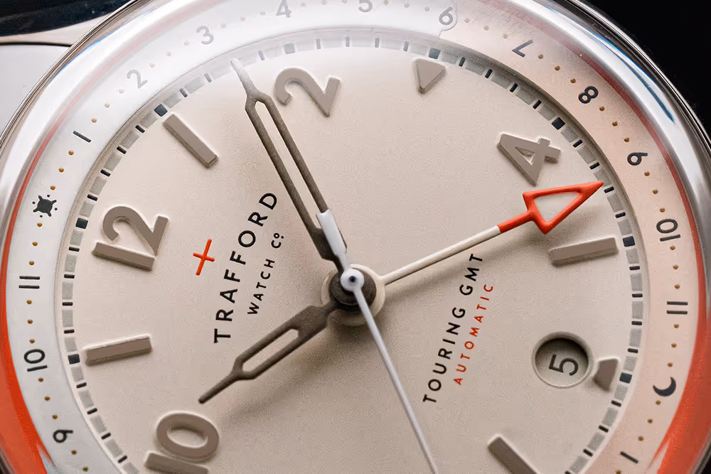 The Touring GMT features this dual time zone functionality that works a little bit differently than most GMT watches on the market. Instead of the usual 24 hour scale with midnight located at the top, the Touring GMT uses an AM/PM scale that is visually split between daylight and nighttime halves, with midnight at the bottom. This allows the wearer to quickly understand if it’s daytime or nighttime back home, giving a more visual connection to loved ones than the more complex military time can.