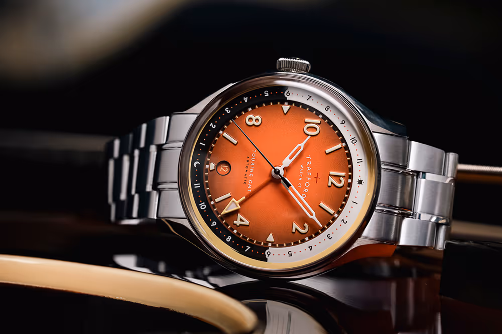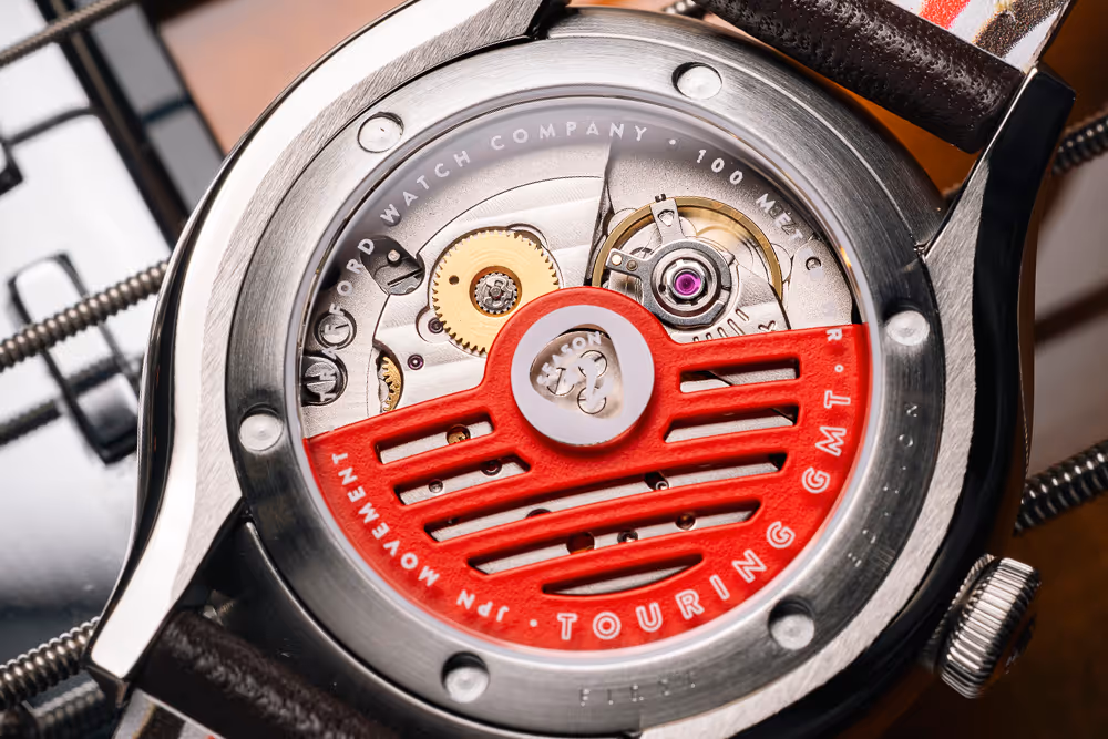 The Touring GMT is powered by the Miyota 9075 “True GMT” movement, designed for easy local time adjustments while the GMT hand stays synced to home. It features a high beat rate of 28,800 vph for smooth seconds-hand motion and a 42-hour power reserve, ideal for travelers.