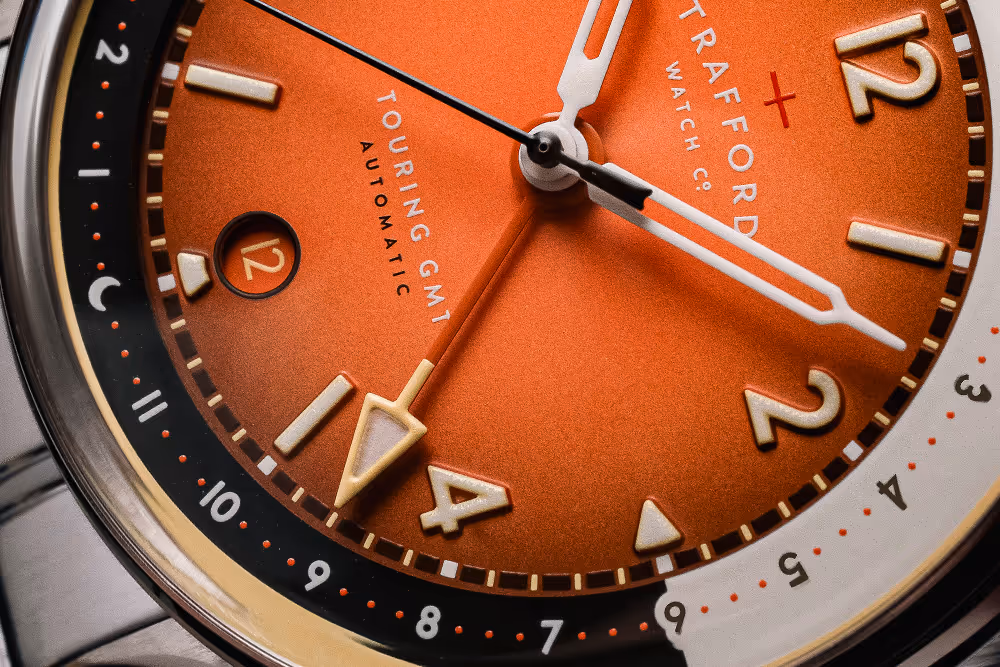 The Touring GMT features this dual time zone functionality that works a little bit differently than most GMT watches on the market. Instead of the usual 24 hour scale with midnight located at the top, the Touring GMT uses an AM/PM scale that is visually split between daylight and nighttime halves, with midnight at the bottom. This allows the wearer to quickly understand if it’s daytime or nighttime back home, giving a more visual connection to loved ones than the more complex military time can.