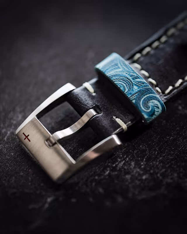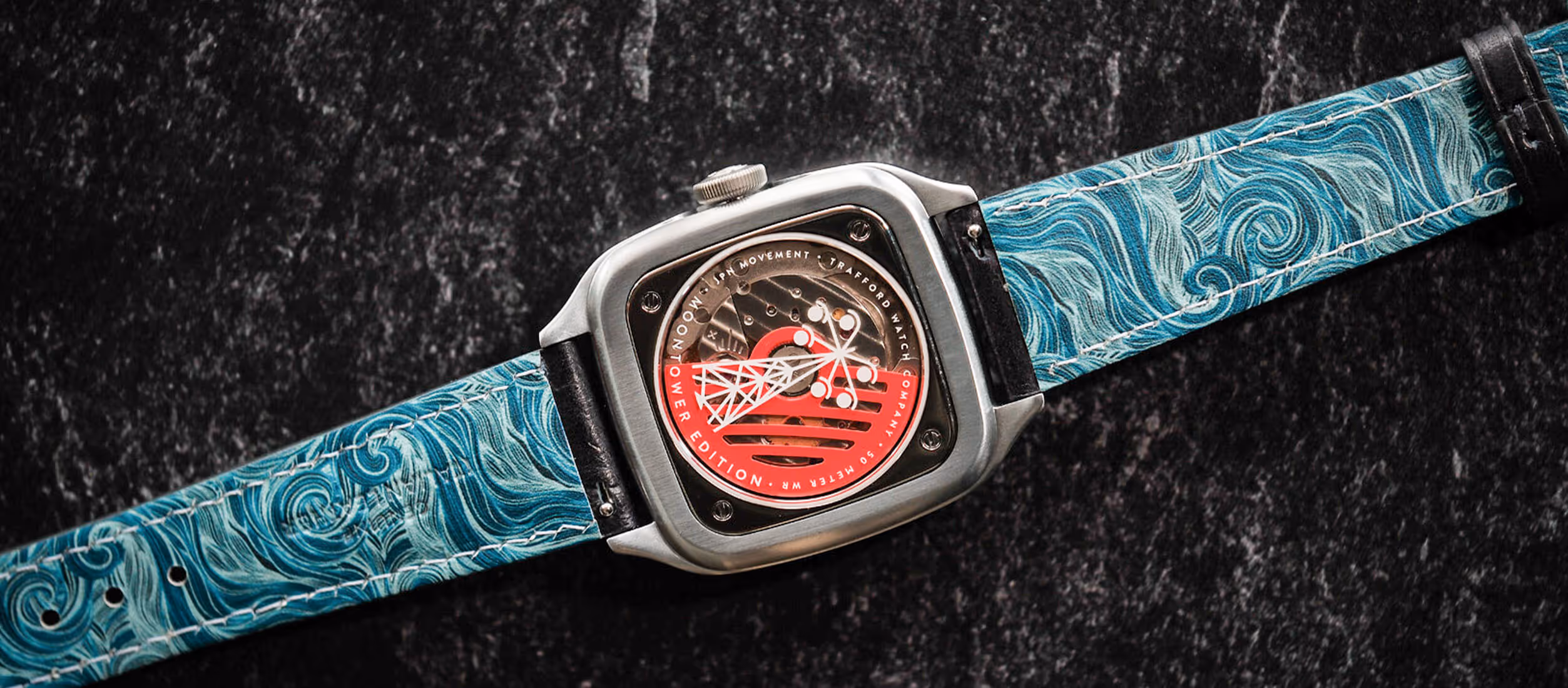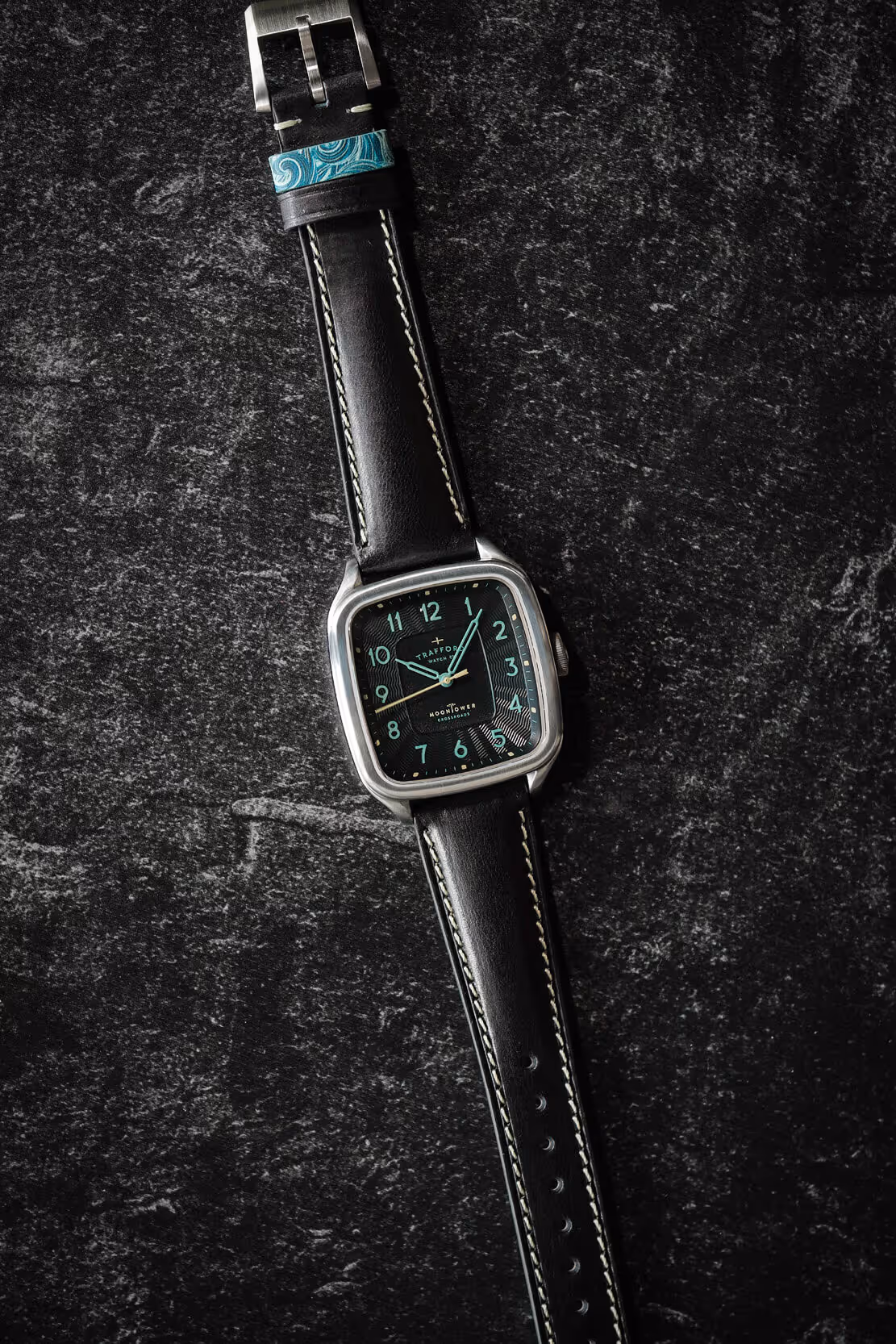 The Moontower Edition comes fitted with a supple, limited-edition Italian leather strap in a deep slate blue that captures the cool tones of Austin after dark. It tapers from 20mm to 16mm for all-day comfort and includes quick-release spring bars for easy changes. On the underside, a custom illustration adds a bit of fun—a soft, abstract pattern representing moonlight flowing across the band. It’s subtle, a little dreamy, and the perfect finishing touch to a watch inspired by the magic of nights in Austin.