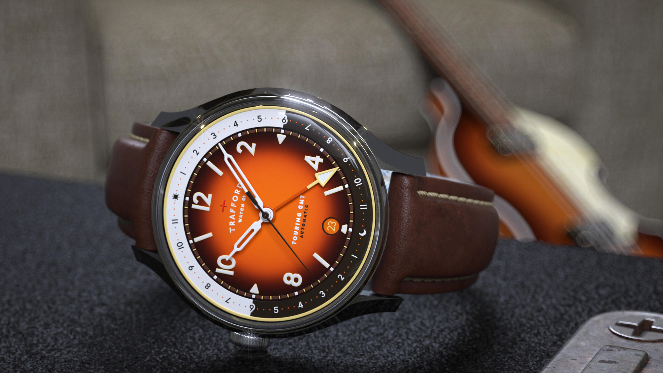 Lefty features a dynamic sunburst dial with bold white markers and luminous hands that cut through the rich gradient tones. The warm GMT track and bright yellow GMT arrow hand echo the melodic optimism of the era, while a matching date window and polished case bring modern clarity to a classic palette. Paired with a soft brown leather strap and left-side crown, this model balances standout design with understated attitude.